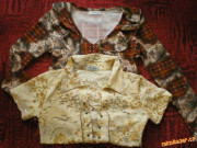Halenka s volánenkem kolem krku, který pokračuje až téměř dolů. Moc hezky to vypadá. Moc příjemný materiál, elastický a jakoby flanel. Mírně rozšířené rukávy. Blůzka je na zavazování koženým provázkem, jakoby z krajky, taky trochu elastické. Cena za oba kusy.