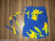 Krásné jasné barvy, modrá se žlutými květy, velmi příjemná vzdušná látkaj. UNI velikost, podle toho, jak uvážete. Nošená, ale bez vady. Moc doporučuji !!!