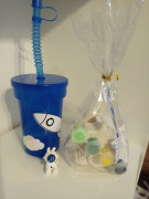 Plastový kelímek s vesmírným motivem, objem 0,4 l....Jako dárek figurka kosmonauta... 2 ks odlitku dinosaurů,4 barvy a štětec.