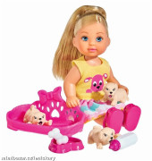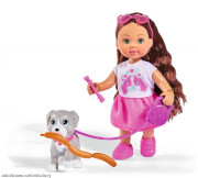 Panenka Evička s pejskem na vodítku a s příslušenstvím, klobásky, které je možno spojit dohromady a miska.